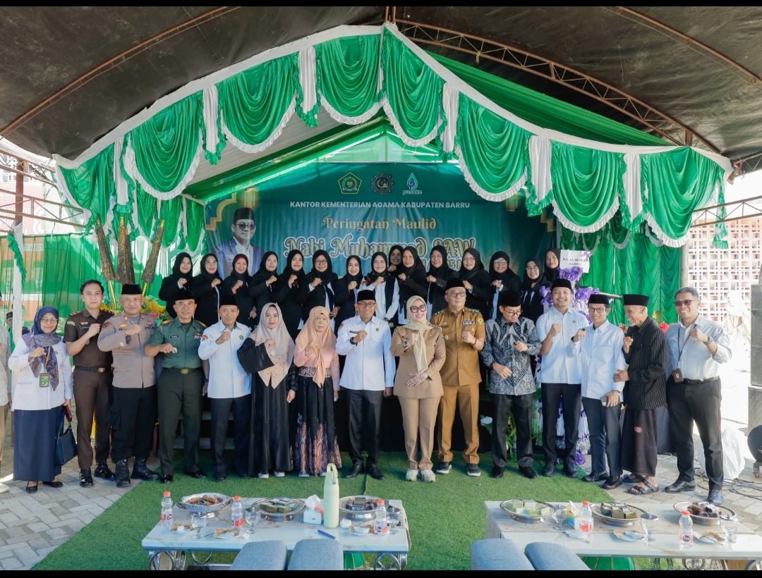 Barru — Bupati Barru, Andi Ina Kartika Sari, S.H., M.Si., bersama Wakil Bupati Dr. Ir. Abustan Andi Bintang, M.Si., menghadiri Peringatan Maulid Nabi Muhammad SAW 1447 H/2025 M yang digelar Kantor Kementerian Agama Kabupaten Barru di halaman Kantor PLHUT Barru, Senin (3/11/2025).